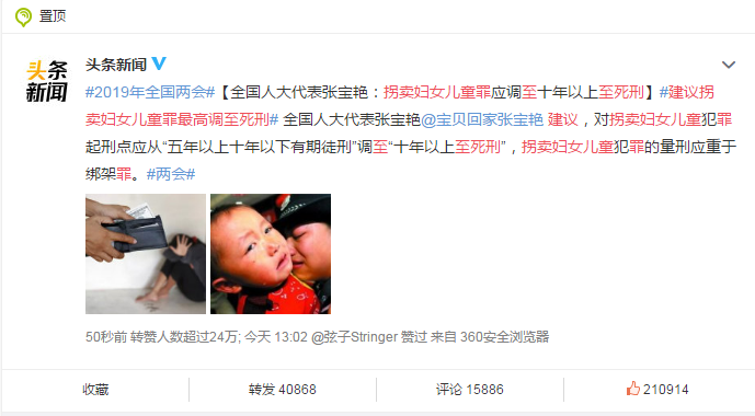 張寶艷代表在今年全國兩會上提議“拐賣婦女兒童罪應調至十年以上至死刑”,引起了社會上的熱議。很多家長紛紛轉發,表達支持。