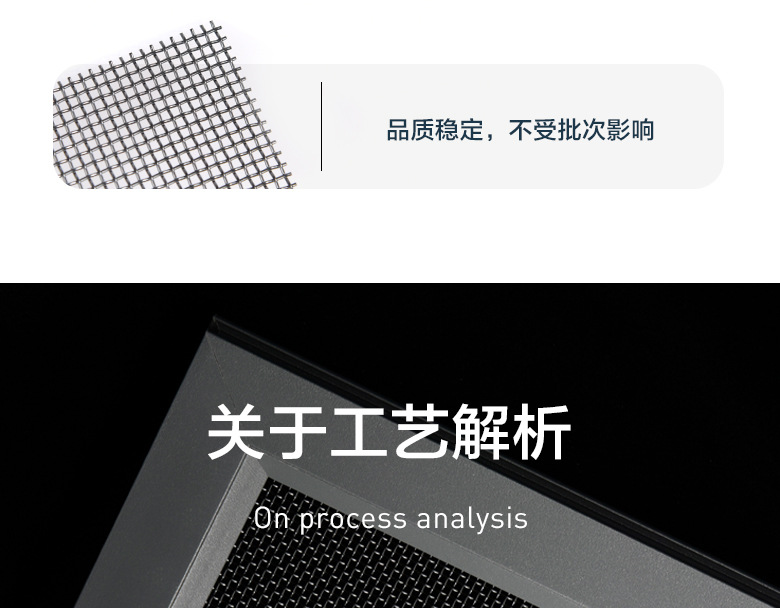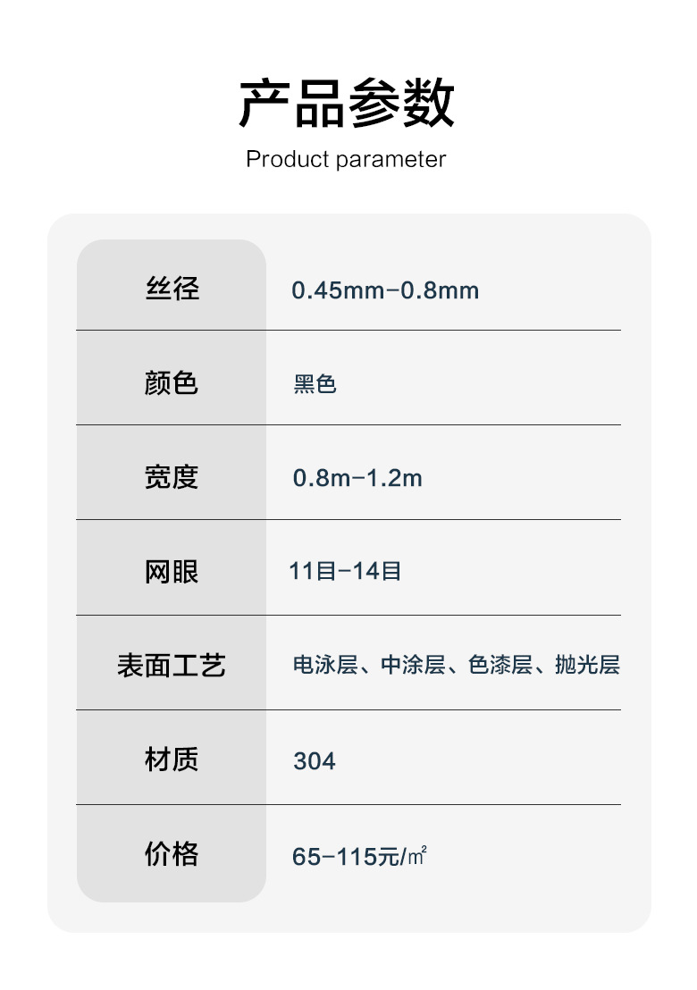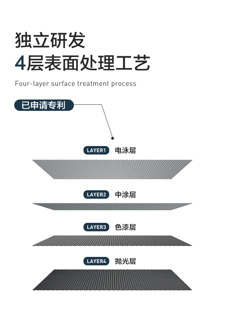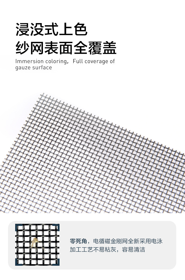 Product Features產品特點:電循磁金剛網采用全新工藝,利用美國PPG Industries的電泳水性漆,對鋼絲進行全方位覆蓋,提供比靜電粉末噴涂更全面的保護,確保絲與絲交織處無一處裸露。電泳涂層不僅保持了產品的通風和采光效果,同時確保網孔方正且均勻,孔徑一致。與傳統工藝相比,產品在抗銹、抗腐蝕能力上有顯著提升,同時解決了靜電粉末噴涂易吸附灰塵難以清潔的問題,光滑涂層提高了清潔效率。該產品還獲得了中國發明專利,填補了市場對高品質差異化產品的需求,尤其適合中高端客戶群體,滿足他們對高品質、無售后問題的期待。