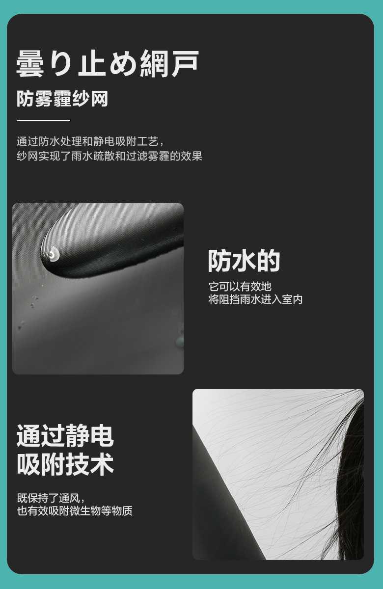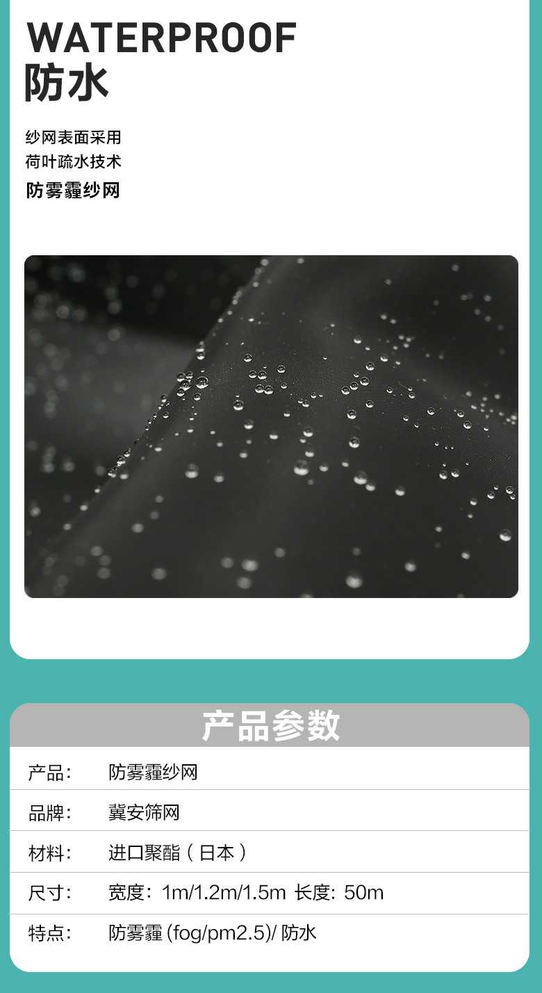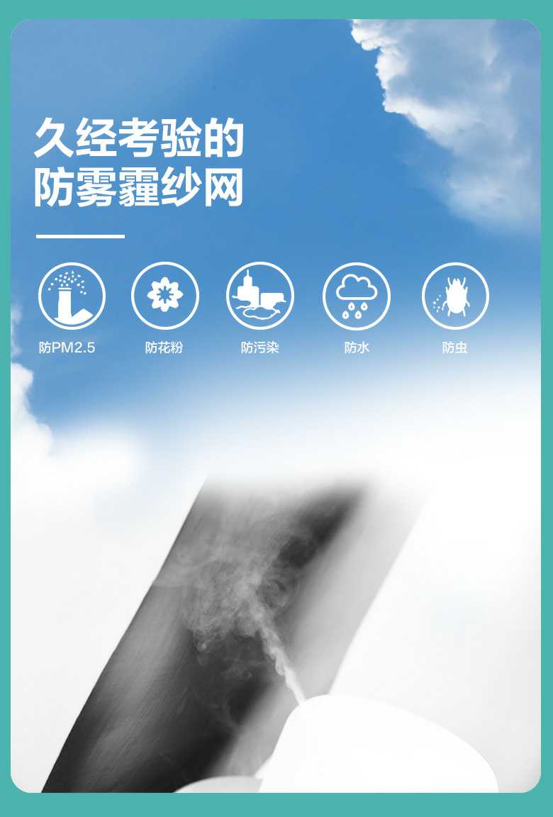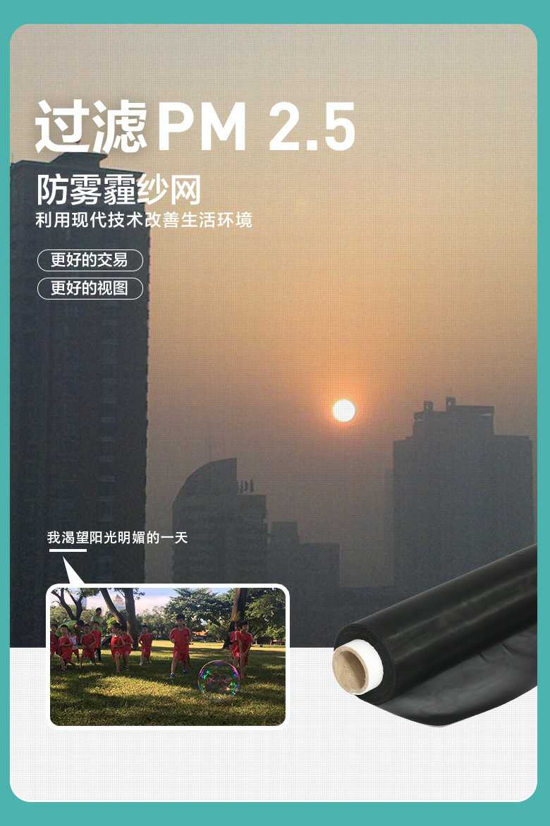 Product Features產品特點:防霧霾紗網采用現代技術,為用戶在霧霾天也能開窗通風提供了解決方案。產品通過表面特殊防水處理來隔絕PM2.5顆粒物,而不是依賴網目密度,從而在保持通風和透光性的同時實現有效防護。由于霧霾顆粒多依附于空氣中的水分,表面處理隔絕水分子,達到了阻隔PM2.5的效果。紗網表面具備荷葉疏水性,大幅提升了清潔的便捷性。