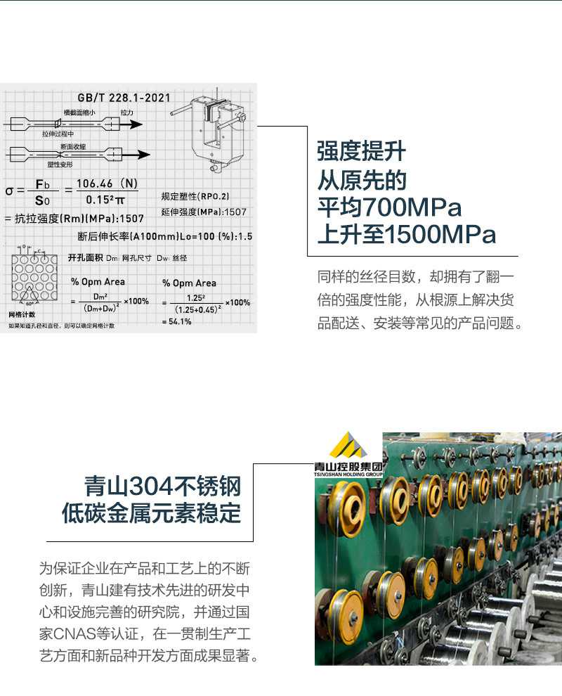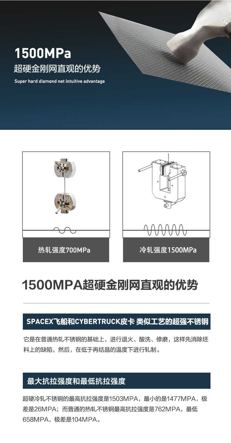 Product Features產(chǎn)品特點(diǎn):1500MPa超硬金剛網(wǎng)采用超硬冷軋不銹鋼材料,經(jīng)過(guò)嚴(yán)格的測(cè)試,其平均抗拉強(qiáng)度為1482MPa,最高達(dá)到1503MPa,最低為1477MPa,極差僅為26MPa。與普通熱軋不銹鋼707MPa的抗拉強(qiáng)度和較大的104MPa極差相比,超硬冷軋不銹鋼在編織過(guò)程中表現(xiàn)出更加均勻的軟硬度,編織出的紗網(wǎng)平整度顯著提升,減少了加工損耗及售后問(wèn)題。該材料經(jīng)過(guò)退火、酸洗、修磨等處理,最終在低溫軋制下形成均勻且表面光滑的不銹鋼,具備極高的抗拉強(qiáng)度、屈服強(qiáng)度和優(yōu)異的松弛性能。類(lèi)似的技術(shù)應(yīng)用于馬斯克的SPACEX飛船和CYBERTRUCK皮卡,體現(xiàn)了這款材料的高端與卓越性能。
