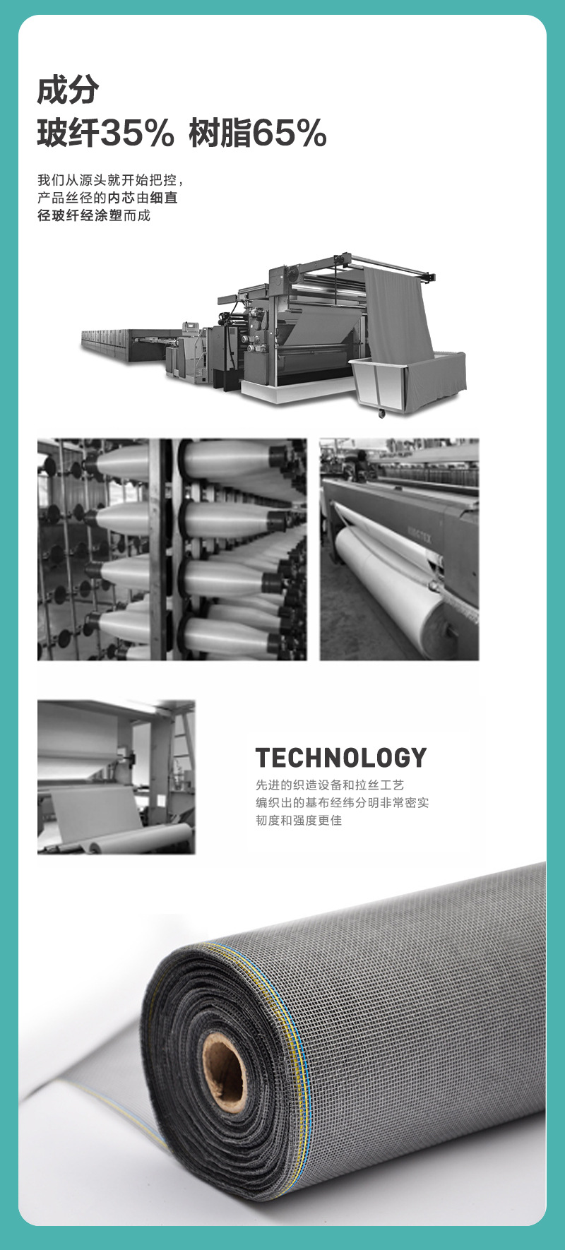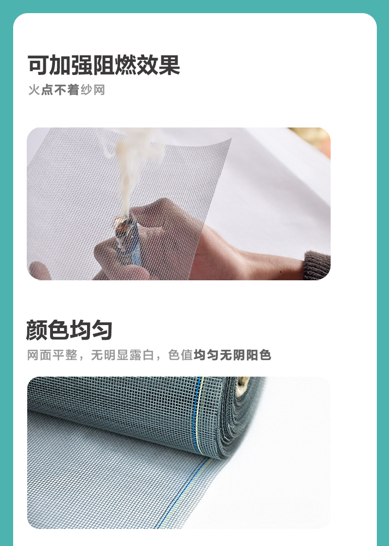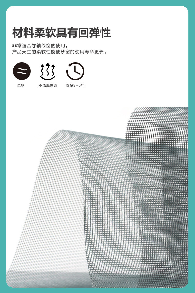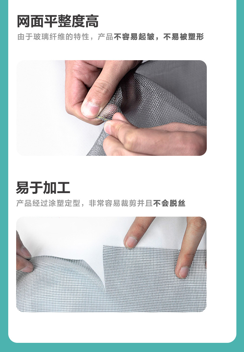 Product Features產品特點:玻璃纖維紗網采用玻璃纖維制成,并覆有耐久的PVC涂層,確保了其在長期使用中的抗腐蝕性和外觀美觀性。相比金屬紗網,它不會生銹或腐蝕,非常適合潮濕環境,并具備良好的抗紫外線性能。即使在密度較高的情況下,這種紗網也能保持良好的通風與自然光透射效果。玻璃纖維紗網柔韌性強,不易彎曲或變形,尤其適合高頻使用環境,如有兒童或寵物的家庭。