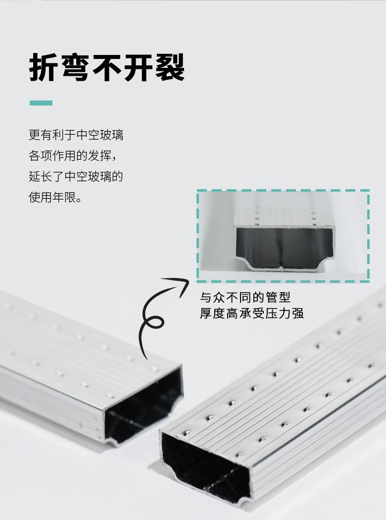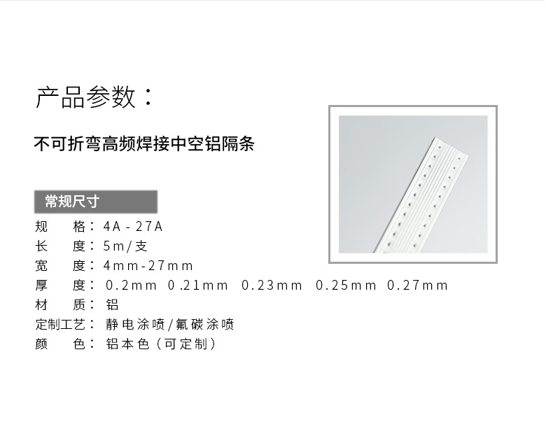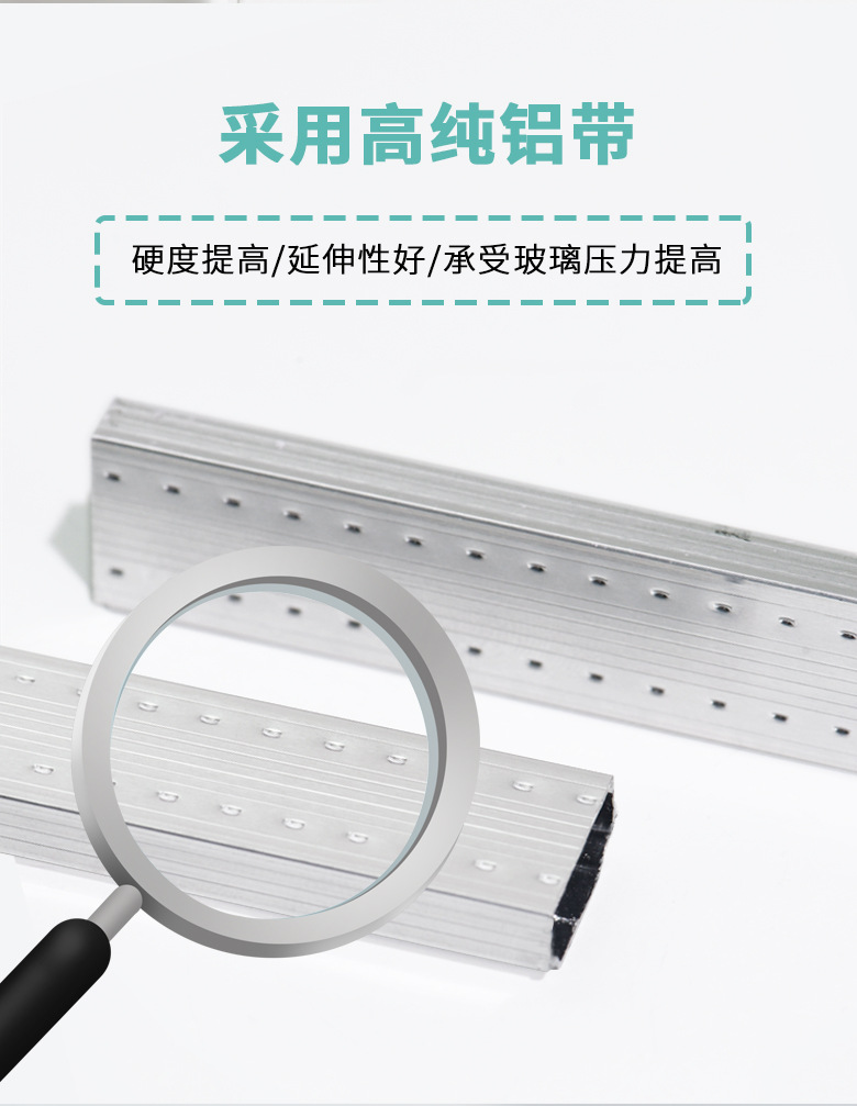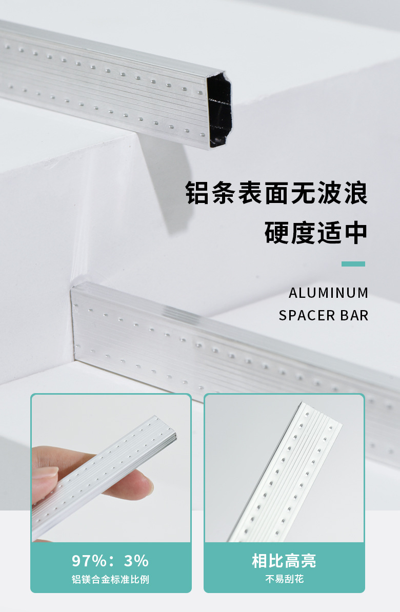 Product Features產品特點:中空玻璃的不可折彎鋁隔條,采用 1100 系列鋁合金,結合其不可折彎的設計,提供了出色的強度和直線度,增強了中空玻璃框架的完整性和美觀。這種鋁隔條經過特殊處理,具有亮麗的表面和均勻的孔透,有助于提升建筑物的外觀及其防水和隔熱性能。其安裝簡便,與塑料連接件兼容,有效節省了施工時間和成本,使其在建筑材料市場中廣受歡迎。