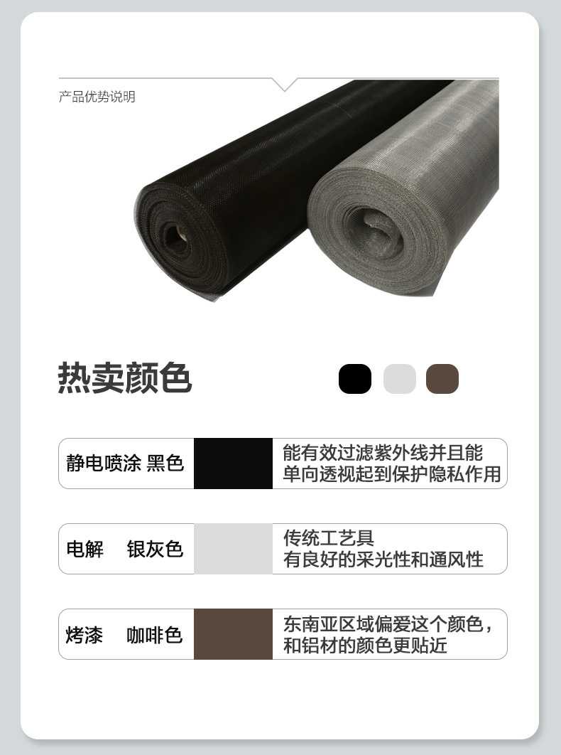 鋁合金窗紗因其耐用性和輕便性成為家庭和工業應用中的理想選擇。它采用高強度鋁合金制成,不易生銹或腐蝕,即使在潮濕或高溫環境中也能保持穩定性能,非常適合沿海和高濕度地區的使用。鋁合金天然具有抗氧化性,防止窗紗在潮濕環境中生銹或發霉,確保長時間使用后仍能保持良好狀態,廣泛用于家庭窗戶、陽臺和門的防護系統,提供防蟲、防塵及通風功能,改善居住環境。