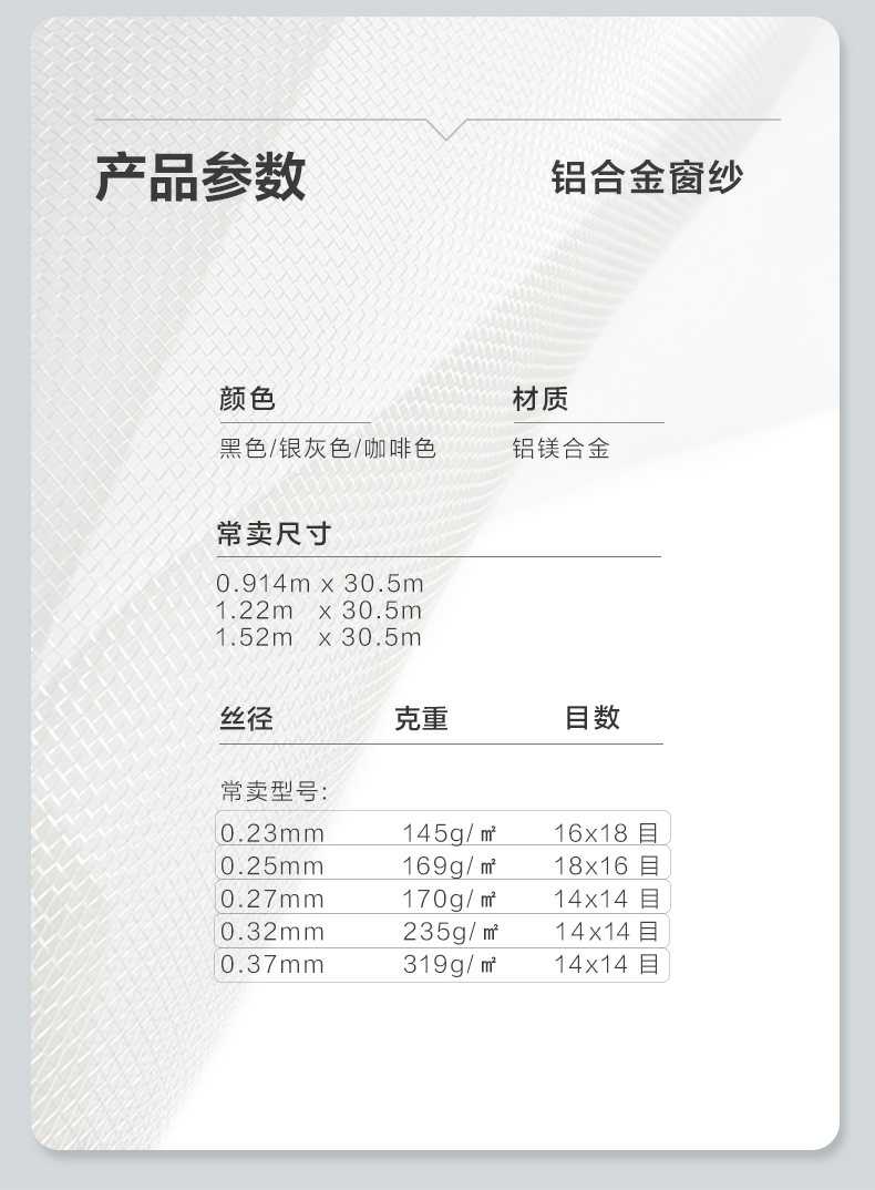 Weft yarn diameter 緯線絲徑:0.23mm +0.01/-0.01mm