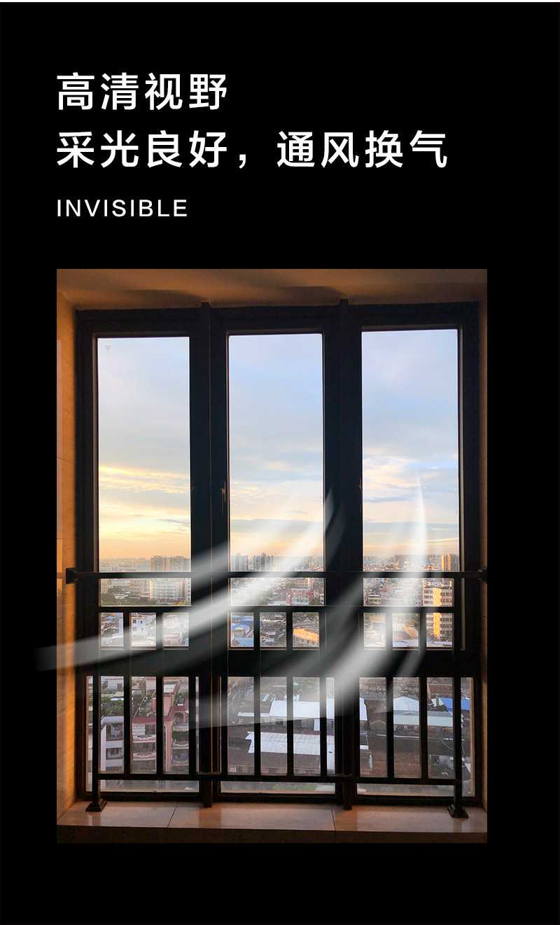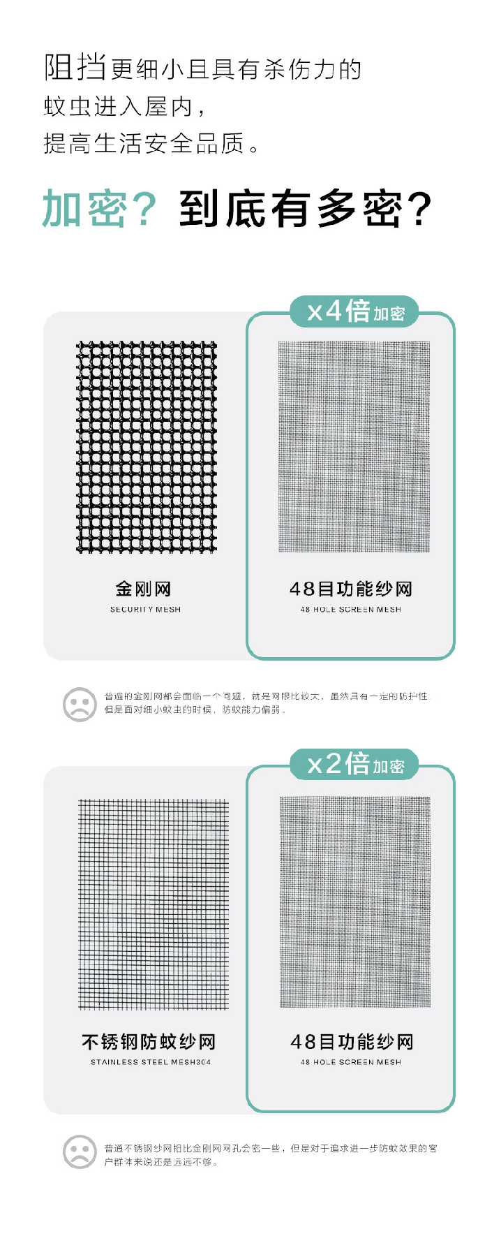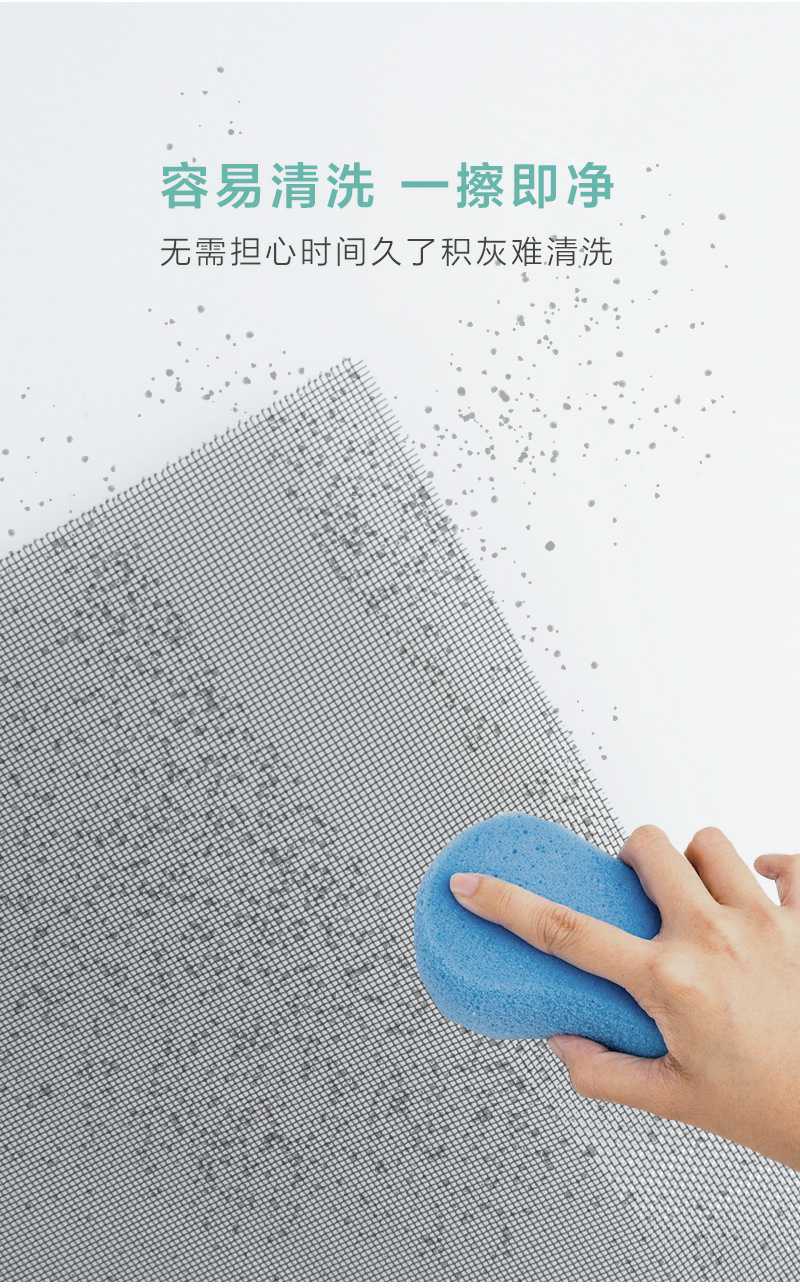 Product Features產品特點:48目功能紗網在家居環境中表現優異,能阻隔95%以上的常見昆蟲,尤其是細小且具有威脅的蚊蟲,顯著提升生活的安全與舒適性。相比市場上其他金剛網系列產品的較大網孔設計,該紗網提供更強的防蚊能力。盡管孔徑較小,但因絲徑細密,確保了良好的通風率(59%)和透光率(69%)。采用PET材料制成,并將延展性控制在20%,有效避免使用過程中因撞擊導致的網面變形問題。靜電駐極技術賦予紗網卓越的防塵效果,網面能像磁鐵一樣吸附并捕捉小顆粒,防止細微灰塵進入室內。PET材料光滑的表面還使清潔更加輕松,即使使用一段時間后也易于維護。