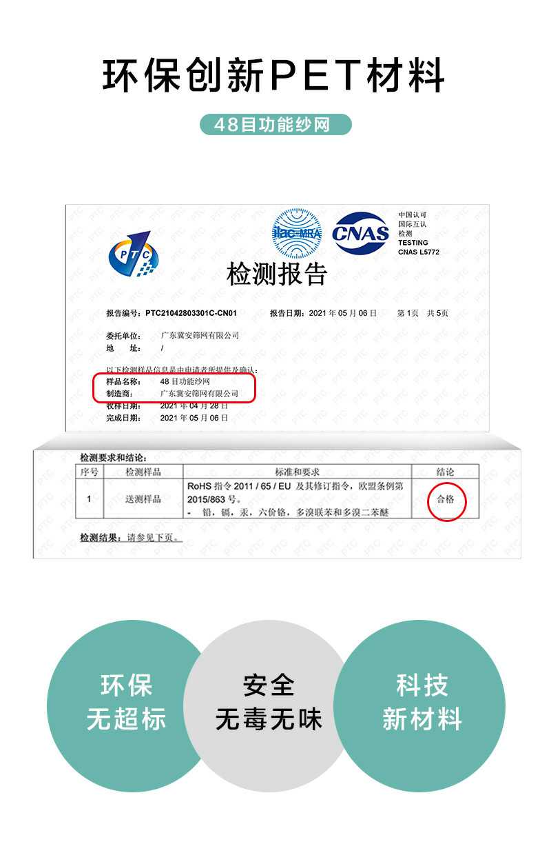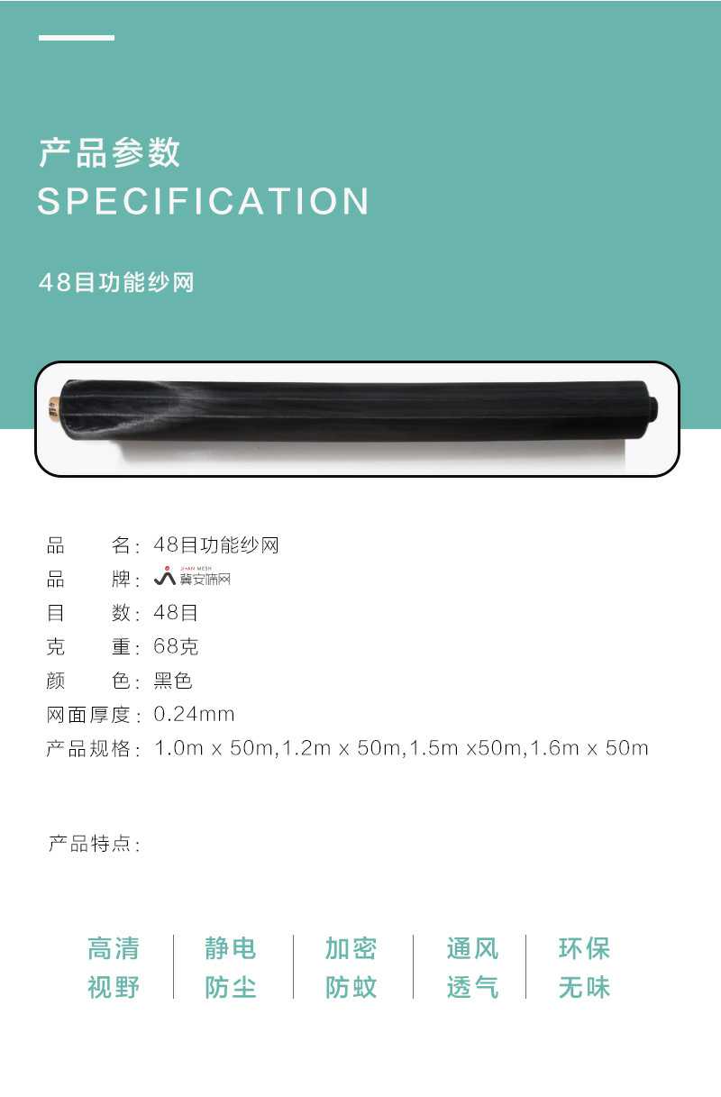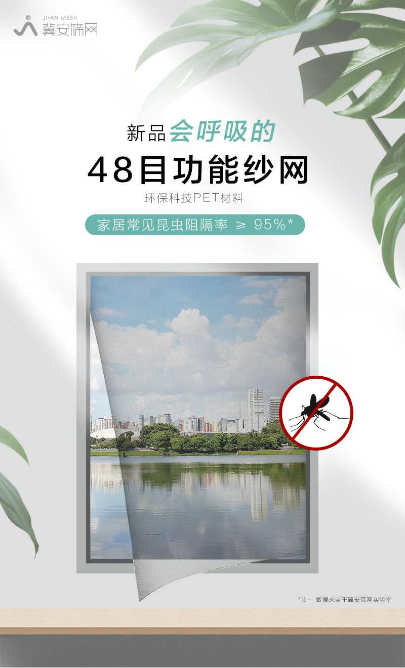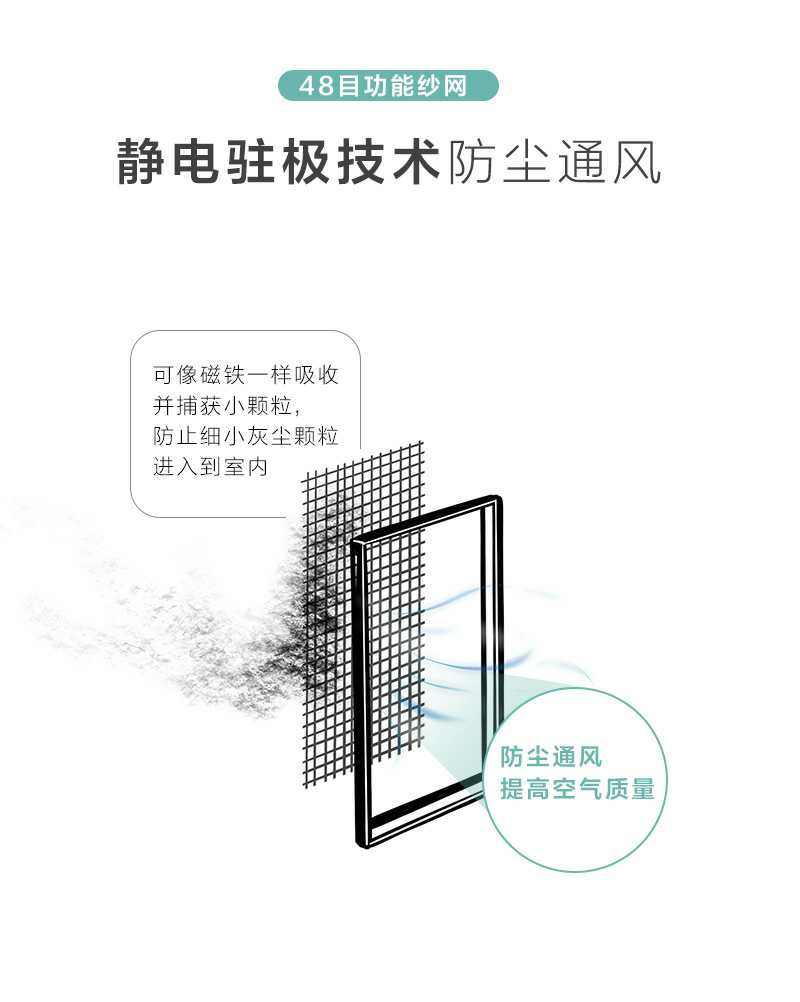 Product Features產品特點:48目功能紗網在家居環境中表現優異,能阻隔95%以上的常見昆蟲,尤其是細小且具有威脅的蚊蟲,顯著提升生活的安全與舒適性。相比市場上其他金剛網系列產品的較大網孔設計,該紗網提供更強的防蚊能力。盡管孔徑較小,但因絲徑細密,確保了良好的通風率(59%)和透光率(69%)。采用PET材料制成,并將延展性控制在20%,有效避免使用過程中因撞擊導致的網面變形問題。靜電駐極技術賦予紗網卓越的防塵效果,網面能像磁鐵一樣吸附并捕捉小顆粒,防止細微灰塵進入室內。PET材料光滑的表面還使清潔更加輕松,即使使用一段時間后也易于維護。