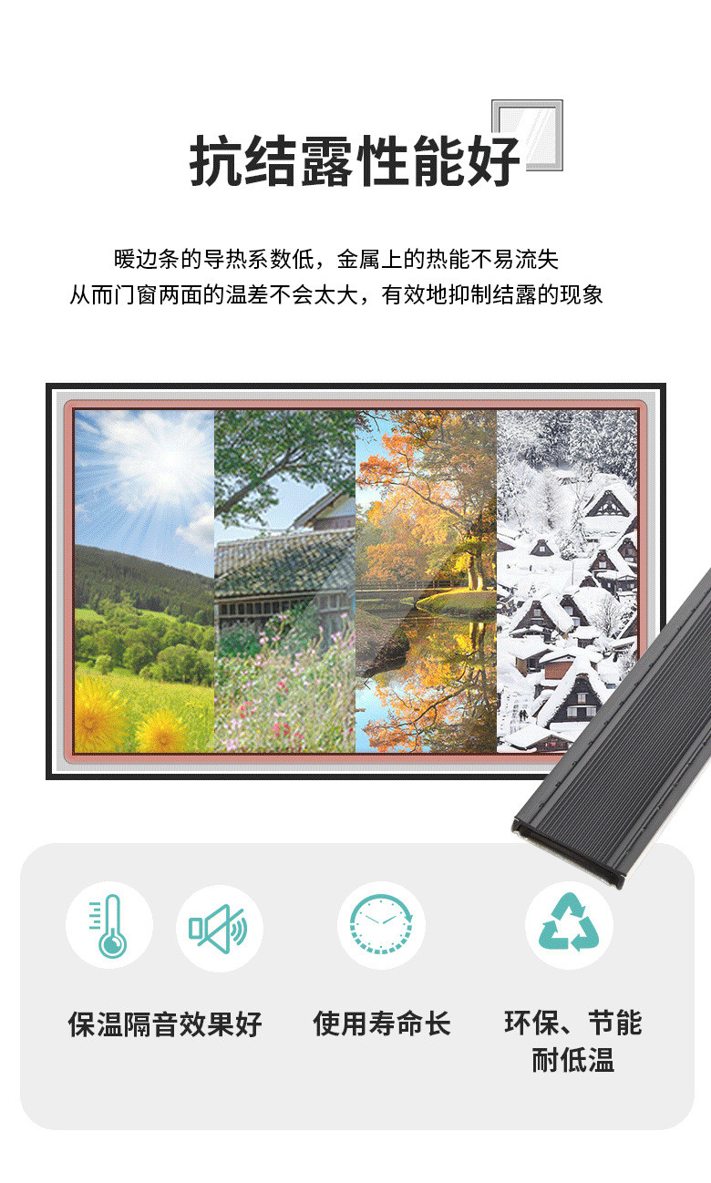 產品采用醫用級不銹鋼+UPVC,通過冷熱共擠工藝,復合而成。形成密封結構嚴密的一體型材,做到完美氣密性的同時達到了更為優良的隔熱性能!在PVC的基礎上做了硬化處理,使得其具有更好的具有更好的耐候性和防火性能,同時UPVC則不會釋放有害物質,屬于綠色環保材料。比普通暖邊條具備更好的性能及操作便利。