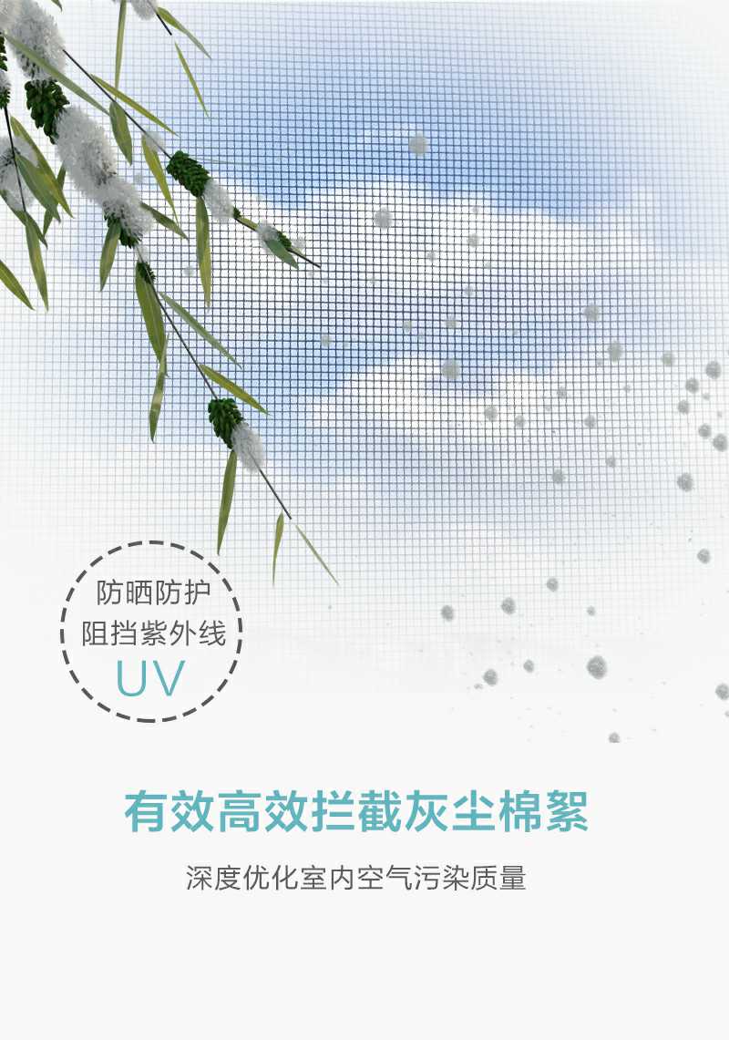 這款產品采用加密網眼設計,有效阻擋柳絮和細小蚊蟲的入侵,同時保持70%的通風率和75%的透光率,確保了良好的使用體驗,明顯優于傳統玻璃纖維紗網。此外,PP材質比玻璃纖維更耐老化、壽命更長,提升了紗網的使用價值。