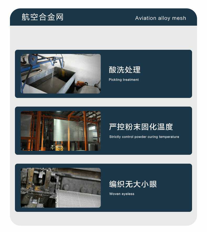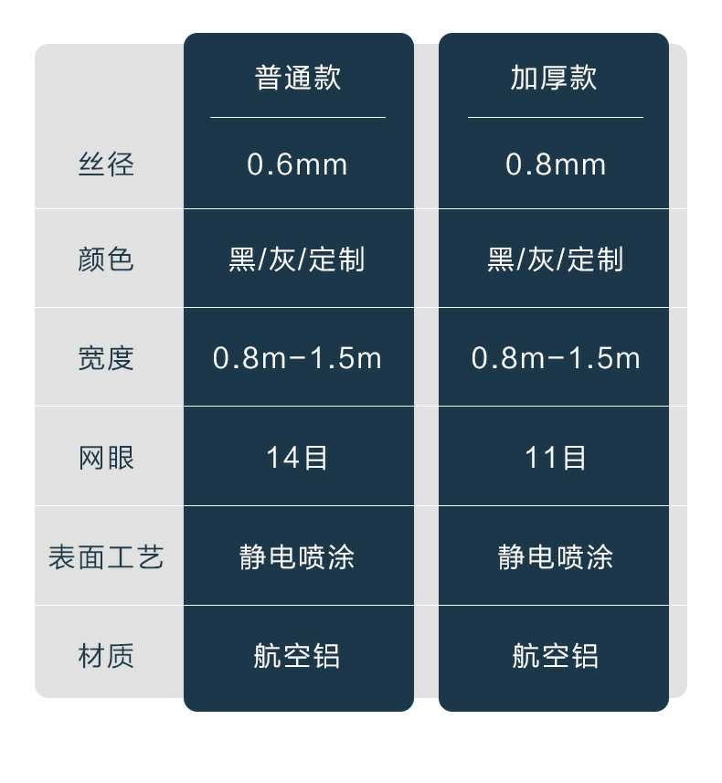 Product Features產品特點:航空合金網自2017年發售以來,表現出極高的穩定性,至今未有生銹或氧化的投訴,非常適用于沿海城市,其突出的抗腐蝕性能備受好評。盡管鋁合金的韌性和強度不及304不銹鋼,但其與型材接觸不會產生電化學反應,而304材料則可能加速鋁型材的氧化或自身生銹。雖然鋁合金的抗拉強度僅為304不銹鋼的四分之一,但仍支持使用螺絲固定,且使用壽命不受影響。首批訂單已近10年,產品未出現老化或破損,僅粉末有輕微褪色,不影響防護功能。該產品通過了高溫和低溫測試,能在60℃的高溫環境中長期使用且結構穩定,在-25℃的低溫下也不會斷裂。